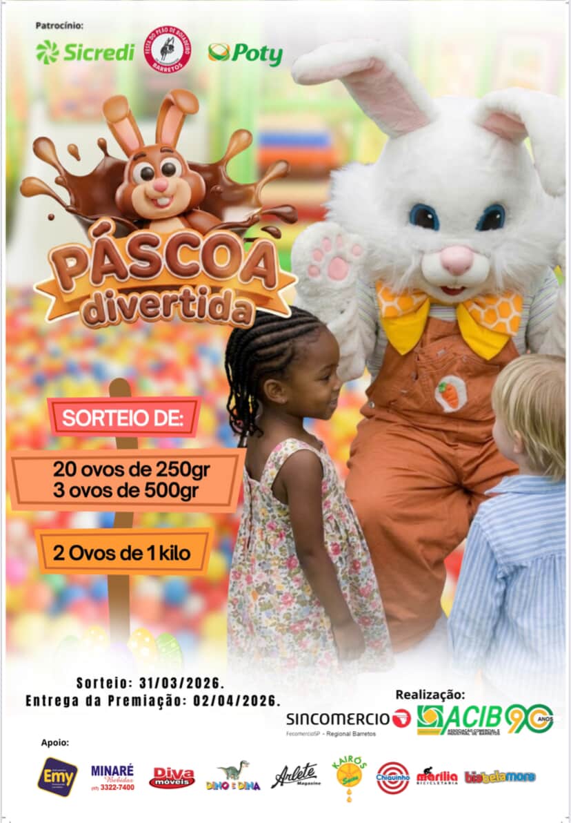 A campanha “Páscoa Divertida” integra o calendário de ações promocionais realizadas pelas entidades representativas do comércio, com o objetivo de fortalecer as vendas, valorizar os empreendedores locais e movimentar o comércio de Barretos e conta com patrocínio do Sicredi, do Clube Os Independentes e da Poty, além do apoio das empresas Perfumaria Emy, Minaré Bebidas, Diva Móveis, Dino & Dina, Arlete Magazine, Kairos Sucos, Chiquinho Sorvetes, Marília Joalheria e Bella More.