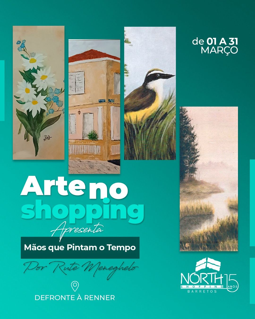 De 1º a 31 de março, a artista barretense Rute Meneghelo apresenta a exposição “Mãos que Pintam o Tempo”, no espaço de eventos localizado em frente à loja Renner, no North Shopping Barretos.