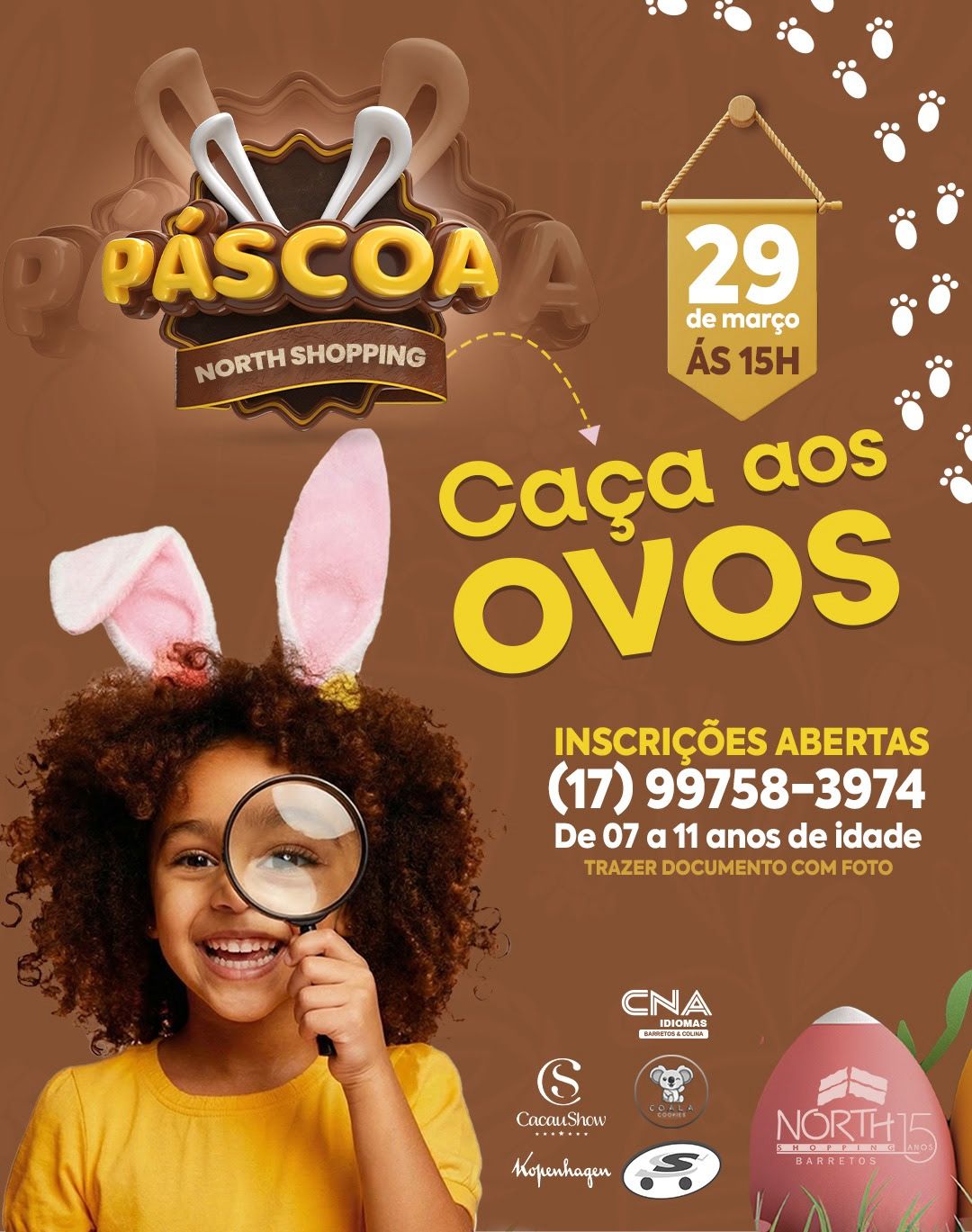 O North Shopping Barretos realiza no próximo domingo, 29 de março, às 15h, a tradicional Caça aos Ovos de Páscoa, ação gratuita voltada a crianças de 7 a 11 anos. A atividade acontece pelos corredores e áreas abertas do empreendimento, envolvendo os participantes em uma dinâmica lúdica inspirada nos elementos da Páscoa.