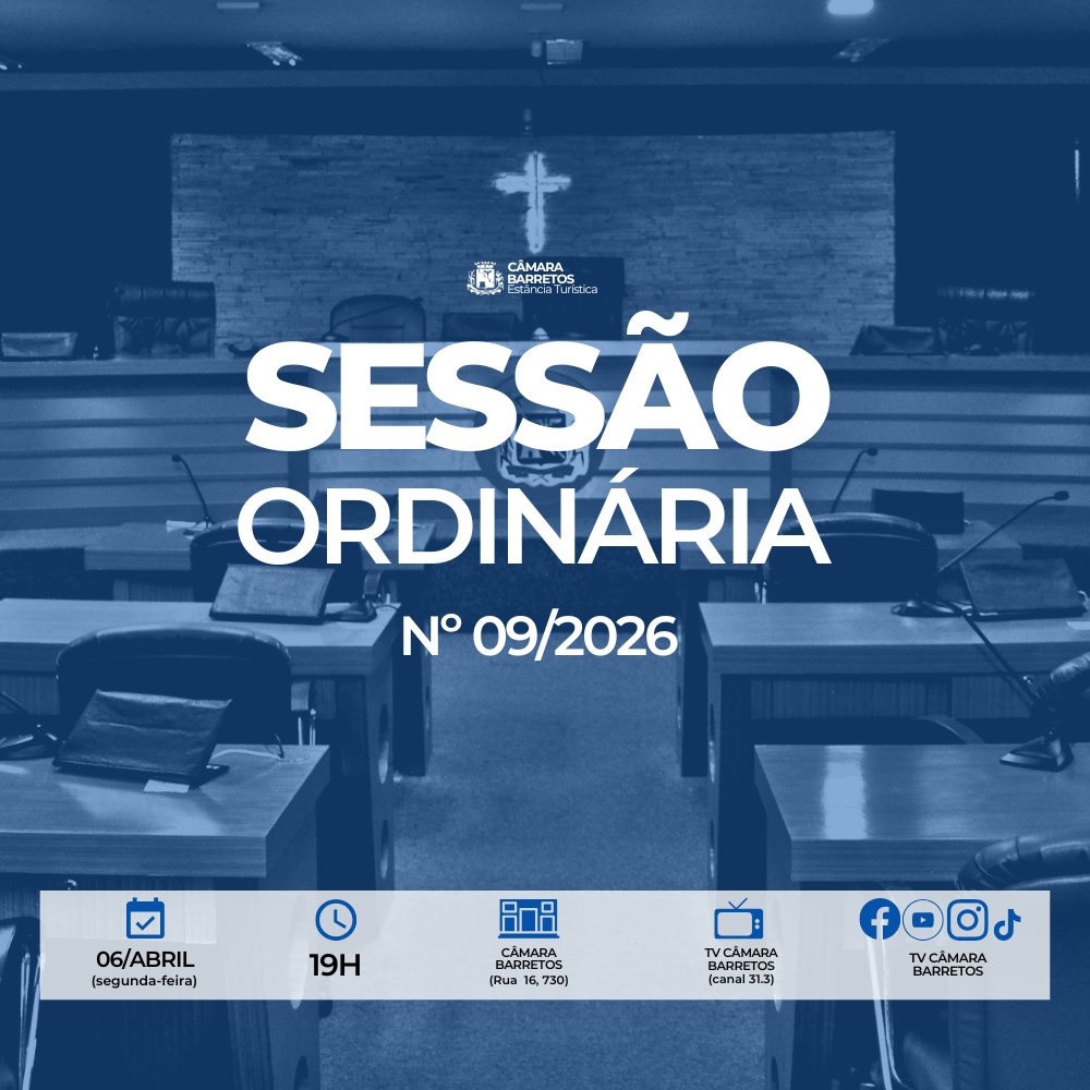 A Câmara de Barretos realizará na segunda-feira (06/abril), às 19h, a 9ª Sessão Ordinária de 2026. Ao todo serão discutidas e votadas 04 matérias: 1 Redação Final e 3 Projetos de Lei.